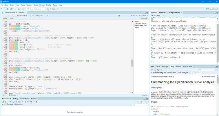 En premier, j’ai réorganisé la fenêtre de Rstudio. Clairement, la partie la plus utilisée est le script, et les parties les moins utilisées l’environnement et la console.