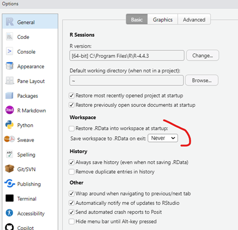 En parlant de global option, veuillez bien à DECOCHER l’option de workplace. En tant que chercheur, on ne veut jamais enregistrer les rdata car les chercheurs qui voudraient reproduire notre résultat ne le pourraient pas. Il y a des cas où l’on veut enregistrer notre environnement, mais dans ce cas on peut le faire à la main :