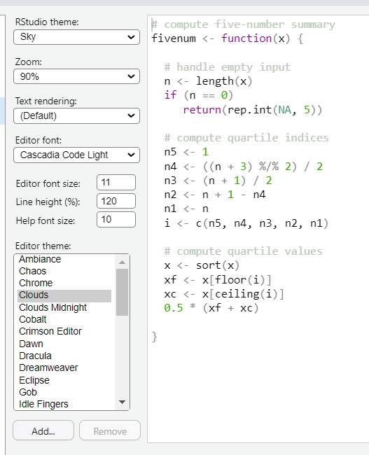 Ce ne sont pas forcément des paramètres optimaux parce que je n’ai pas les mêmes sur mon écran 32 pouces (sur celui avec ces paramètres, l’écran est de 15 pouce). Généralement il faut bien distinguer les commentaires du code par une couleur différente, bien distinguer les mots entre parenthèses de ceux qui n’en sont pas et les nombres des textes. Le thème clouds le fait pas trop mal mais d’autres seront peut-être plus à votre goût. Ce qui va beaucoup changer entre les personnes c’est surtout la taille du texte. De mon côté, j’aime avoir un texte assez petit pour avoir une bonne vision globale du script, mais pas trop petit pour ne pas me tromper de ligne quand j’écris. Et la taille du texte change avec l’écran donc il faudra jongler en fonction de votre confort.