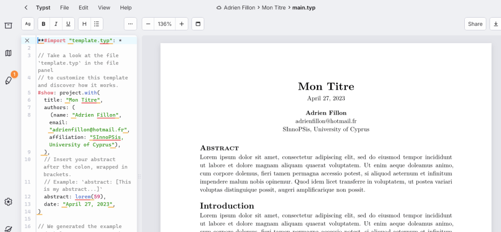 Typst est à la fois un système d’écriture et un site internet qui permet d’écrire des articles. Contrairement à word (et comme overleaf), Typst ne charge pas immédiatement les images et le texte et permet donc d’écrire instantanément. De plus, il lie le référencement à la bibliographie ce qui permet d’éviter (comme sur word) d’avoir des citations dans le texte qui ne sont pas en bibliographie et vice-versa. Un gain de temps énorme quand le texte est finit et qu’il faut regarder à la main que la bibliographie est bien mise. Et contrairement à Overleaf, la création d’image et de tableau n’est pas horriblement difficile à coder (c’est plus compliqué que sur word mais ce n’est pas infaisable). Enfin, Typst permet de facilement télécharger une version pdf (comme overleaf) MAIS AUSSI une version word. Et ça c’est cool quand faut collaborer avec des gens qui ne jurent que par word.