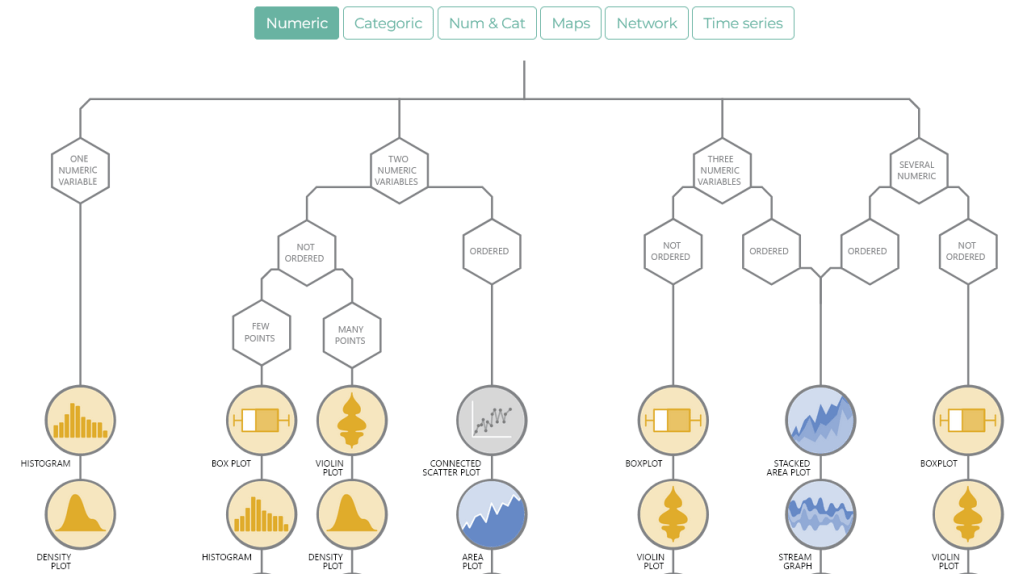 Si vous ne savez pas quelle serait la meilleure manière de présenter vos données, vous trouverez ici : https://www.data-to-viz.com/ un arbre de décision pour trouver la plus belle manière de les présenter. Vous trouverez ensuite ici : https://r-graph-gallery.com/index.html le code pour le présenter.